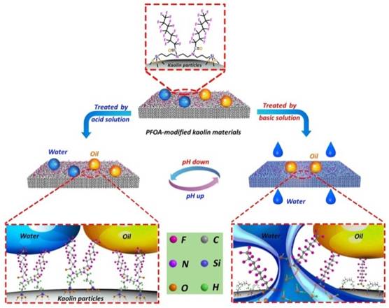 基于以上现状,公司屈孟男教授研究团队结合公司的矿业学科特色与矿物加工专业优势,以来源广泛的矿物高岭土出发,通过在其颗粒表面修饰低表面能化合物,成功制备得到具有pH响应性能的智能超浸润材料。