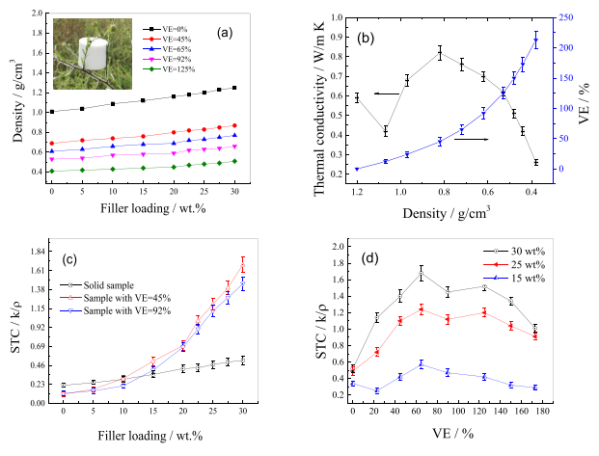 发泡技术是降低聚合物密度和质量的重要手段,但引入的空气热导率仅为聚合物的1/10,使得聚合物泡沫变成了绝热材料。如何提高低密度泡沫聚合物的热导率是制备轻质导热聚合物的关键所在,基于此理念和实际需求,本研究设计和制备了一种具有多孔结构的氮化硼纳米片(BNNSs)/交联聚苯乙烯(c-PS)复合材料。借助于纯水为起泡剂,在泡沫形成过程产生的圆形泡孔及应力使得原本均匀分布在聚合物内的BNNSs在环形应力作用下在气泡之间的泡壁内形成环形结构的取向分布,这样借助于泡空的形成及孔径发展,使得原本不相连接的BNNSs之间产生了相互连接结构,借助于发泡诱导的BNNSs构建的3D网络为声子传递铺设了高速通道。另一方面泡孔产生又降低热导率,因此,复合体系的热导率与BNNSs形成的网络结构密切相关,而BNNSs的导热通路的构建与发泡比、BNNSs用量、泡孔直径及泡孔密度等因素相关。本研详细研究了上述因素对多孔结构聚合物的热导率的影响机理,进而讨论了对介电常数及损耗因子的的影响,研究结果表明基于泡孔结构的BNNSs/c-PS在最佳条件下呈现出高达1.28W/mK的热导率,远高于同等填料用量下的未发泡体系的热导率,该材料密度下降了接近1/2。
