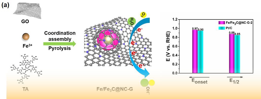基于以上现状,本研究提出了一种由新型金属有机骨架-铁-单宁酸制备核壳结构催化剂的方法。该方法通过水热法合成铁-单宁酸骨架/氧化石墨烯前驱体,随后对其进行高温碳化成功制备了具有核壳结构的ORR阴极电催化材料。单宁酸、金属盐和氧化石墨烯之间的强配位能力有利于金属纳米粒子在石墨烯纳米片上的锚定,提高催化剂的稳定性。以Fe(NO3)3·9H2O为铁源,生成具有高ORR活性的Fe/Fe3C物种。同时,由尿素和单宁酸形成的石墨壳层防止了Fe/Fe3C核不受碱性电解液腐蚀而导致的性能下降。的确,Fe/Fe3C@NC-G-2展示了0.97 V的起始电位,优于商业化的Pt/C催化剂(0.95 V),其极限电流密度(−5.40 mA cm−2)高于商用Pt/C催化剂(−4.80 mA cm−2)。当其应用为氧还原反应催化剂时,此类材料表现出优于 Pt/C 催化剂的稳定性和抗甲醇性能。
