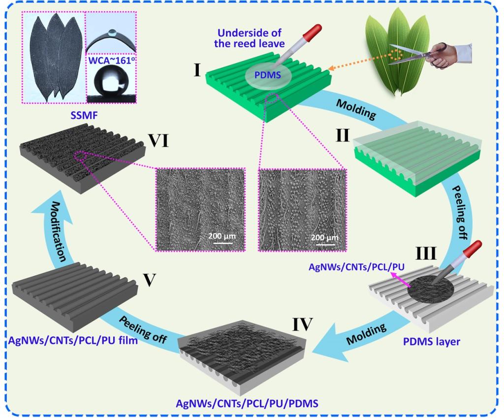 ▲图1 通过生物模板法制备基于形状记忆聚合物的SSMF的示意图。
