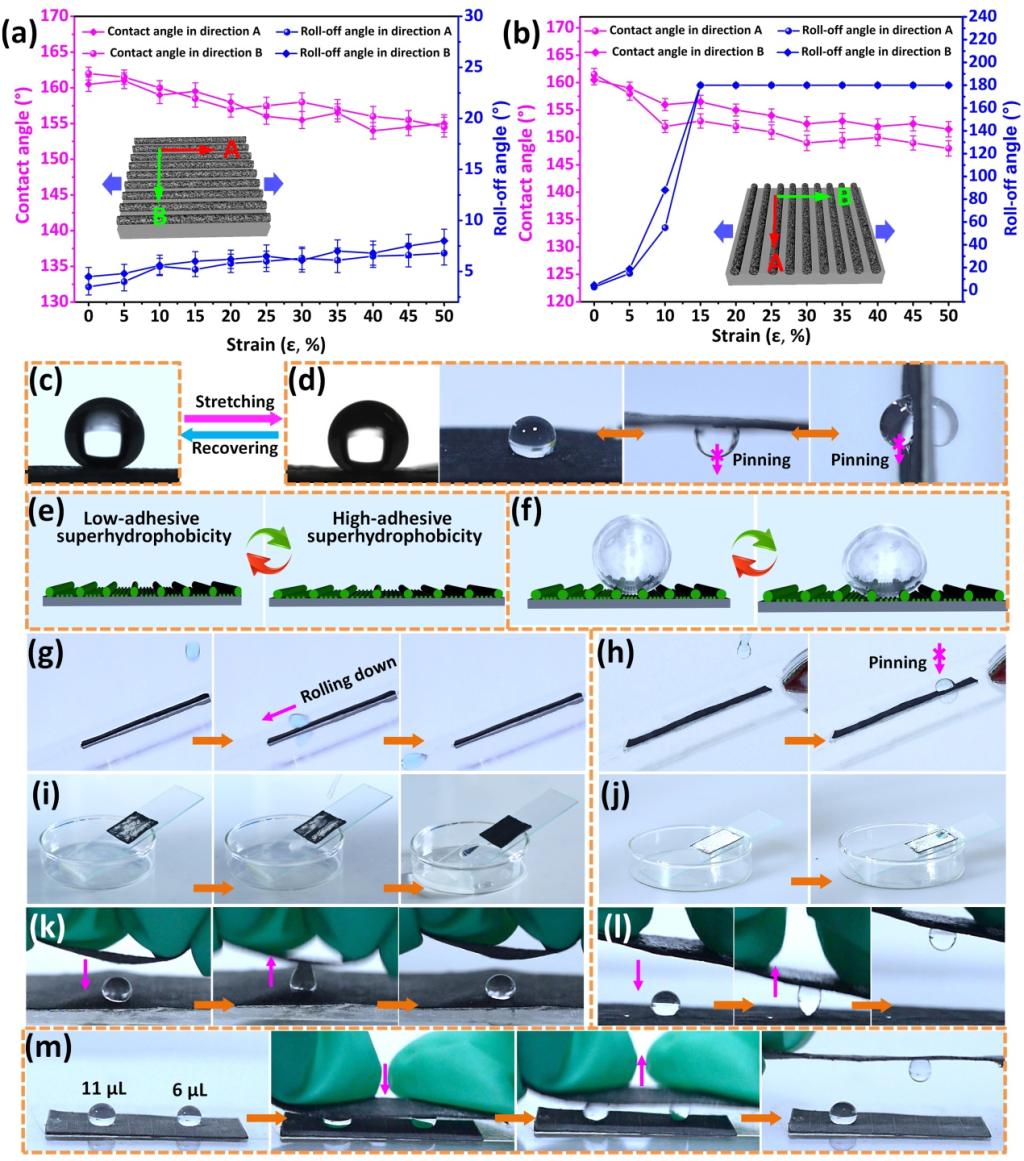 ▲图2 SSMF表面润湿性能的可调控性。(a,b) SSMF表面两个方向的静态接触角和滚转动角随平行(a)或垂直(b)于表面槽结构的拉伸应变(ε = 0 ~ 50%)的变化。(c,d) SSMF表面的低粘附滚动状态(ε = 0%) (c)和高粘附钉扎状态(ε = 15%) (d)。(e,f) 两种不同润湿模式示意图。(g,h) 液滴在原始(g)和拉伸(ε = 15%) (h) 的SSMF表面(倾斜角 ~ 20°)上的运动状态。(i,j) 以粉笔末为污染物,在原始(i)和拉伸(ε = 15%)后的SSMF表面(倾斜角 ~ 20°)的自清洁过程。(k,l) 原始(k)和拉伸(ε = 15%)后的(l) SSMF表面的对水滴的捕获行为。(m) 拉伸 (ε = 15%) 后的SSMF表面对不同体积液滴的选择性抓捕。