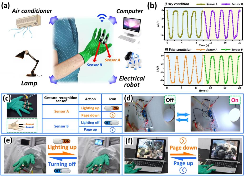 ▲图3 基于SSMF传感器的可穿戴交互设备在物联网控制中的应用。(a) 基于SSMF传感器的交互界面系统的原理图,其中SSMF传感器能够快速、准确、清晰地识别手指感应的不同动作,从而实现对家用电器的智能控制。(b)在干燥(i)和潮湿(ii)条件下,具有动态自除湿性能的SSMF传感器在手指循环弯曲运动过程中的电阻变化。(c) 贴在食指和中指腹关节上的两个基于SSMF的传感器以及它们对不同手指运动的识别和对应所能实现的功能。(d-f) SSMF传感器作为可穿戴互动设备在开/关灯(d)、点亮/关闭微型液晶显示器(e)和控制PowerPoint演示(f)等方面的应用。
