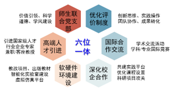(3)建立“师生联合党支部-高端人才引进-软硬件环境建设-深化校企合作-国际合作交流-优化评价制度”的六位一体保障机制