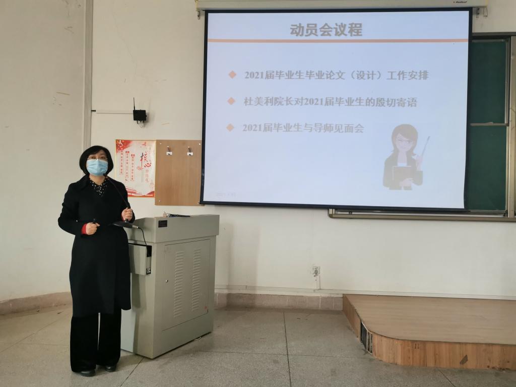 1月13日下午,威廉体育williamhill在临潼校区9-105教室召开了2021届本科毕业论文(设计)动员大会。威廉体育williamhill全体教师与2021届本科毕业生参加了动员大会,按照疫情要求全体师生佩戴口罩、隔位就座。教学经理张亚婷就毕业论文工作题目征集、师生双选、指导教师队伍、员工纪律几个方面做了整体情况的介绍,重点对毕业论文的系统管理、论文查重抽检、教育部下达的论文抽检工作进行了特别要求,对于疫情期间员工毕业论文(设计)的实验室安全管理提出严格要求。希望各位老师和同学按照系统时间截点,完成论文的各个环节,同时踏实认真做实验,诚实写论文,杜美利经理做了总结性的发言,希望大家克服疫情带来的影响,遵守学术诚信与道德,以最真实、最热情、最饱满的状态做好大学四年最后的、也是关键的教学环节,为自己未来的发展奠定坚实的科学实践基础。