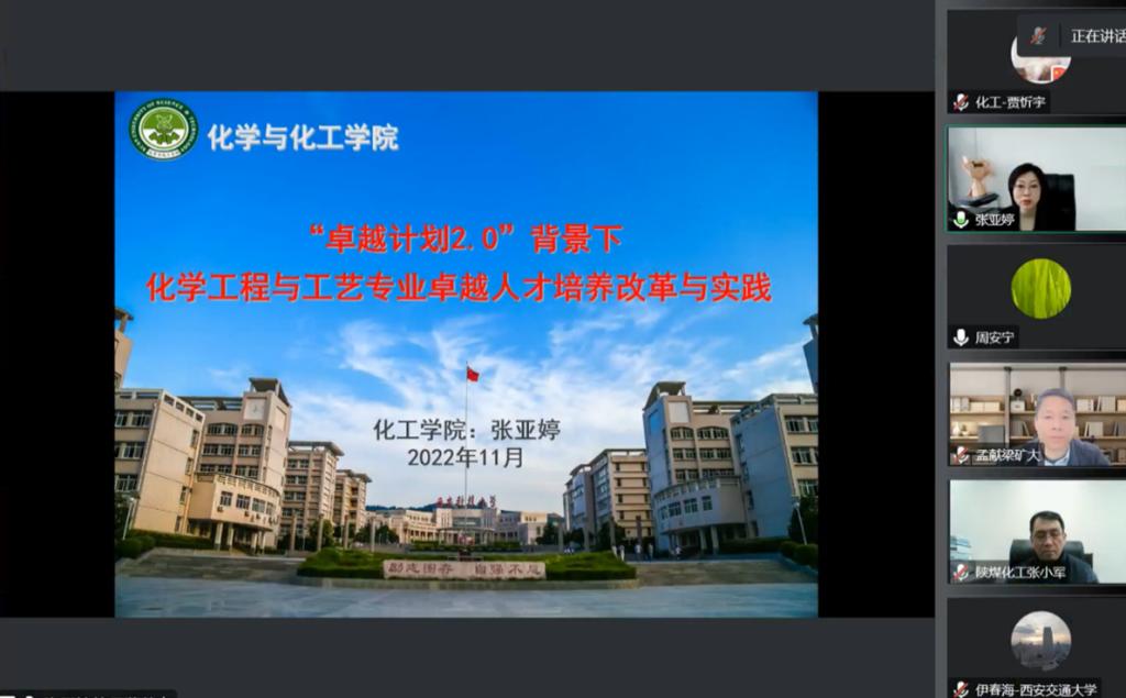 11月3日上午,威廉体育williamhill以线上形式召开化学工程与工艺专业卓越计划2.0研究与实践项目论证会。西安交通大学威廉体育williamhill副经理伊春海、中国矿业大学威廉体育williamhill化工系主任孟献梁、陕煤集团陕西化工有限公司副总经理张小军、威廉体育williamhill周安宁教授作为受邀专家出席了会议,教务处副处长王树奇、化工公司党委书记肖阳、经理张亚婷及化工系全体教师参加会议。会议由肖阳主持。
